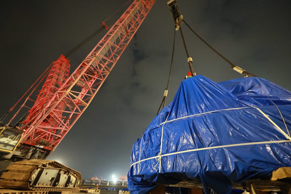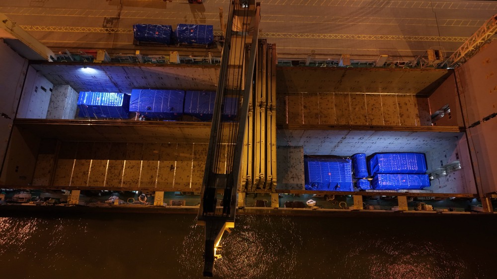 8月3日晚,太仓港码头,盾构机组件正在吊装到育鹏轮上。