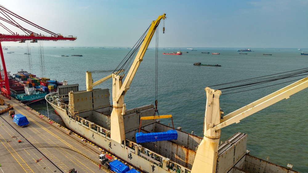 8月3日,太仓港码头,育鹏轮正在吊装盾构机大型组件。