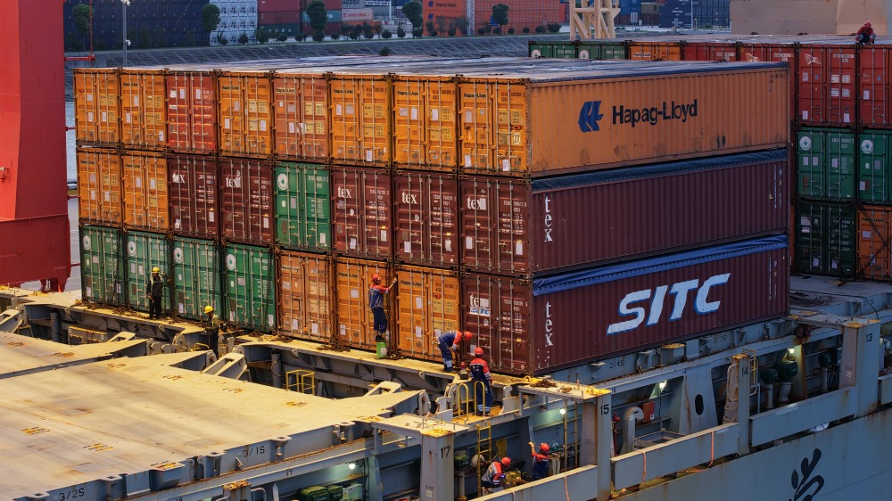 8月5日晚,太仓港集装箱码头,育鹏轮正在装载货物。