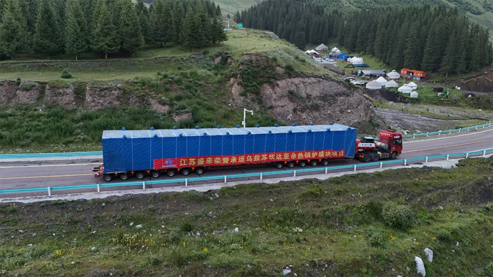乌兹别克斯坦苏坎达亚电站项目中,盛来承担余热锅炉模块跨境运输。设备超长超宽超重,采用分批集中发运,每批6块共4批(2025.6一9)稳步推进。全程护送监控,日更定位报备,严控限速与夜禁,确保装卸规范、安全准时交付。