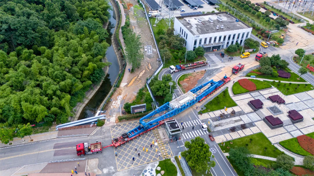 这次运输任务时间“紧”、难度“大”,厂内外道路“复杂”;运送的变压器“体积大”,重量达“500吨”。公司选用前16后16、共32轴桥式梁运输车,采用前拉后推的运输方式,车组总长98米。